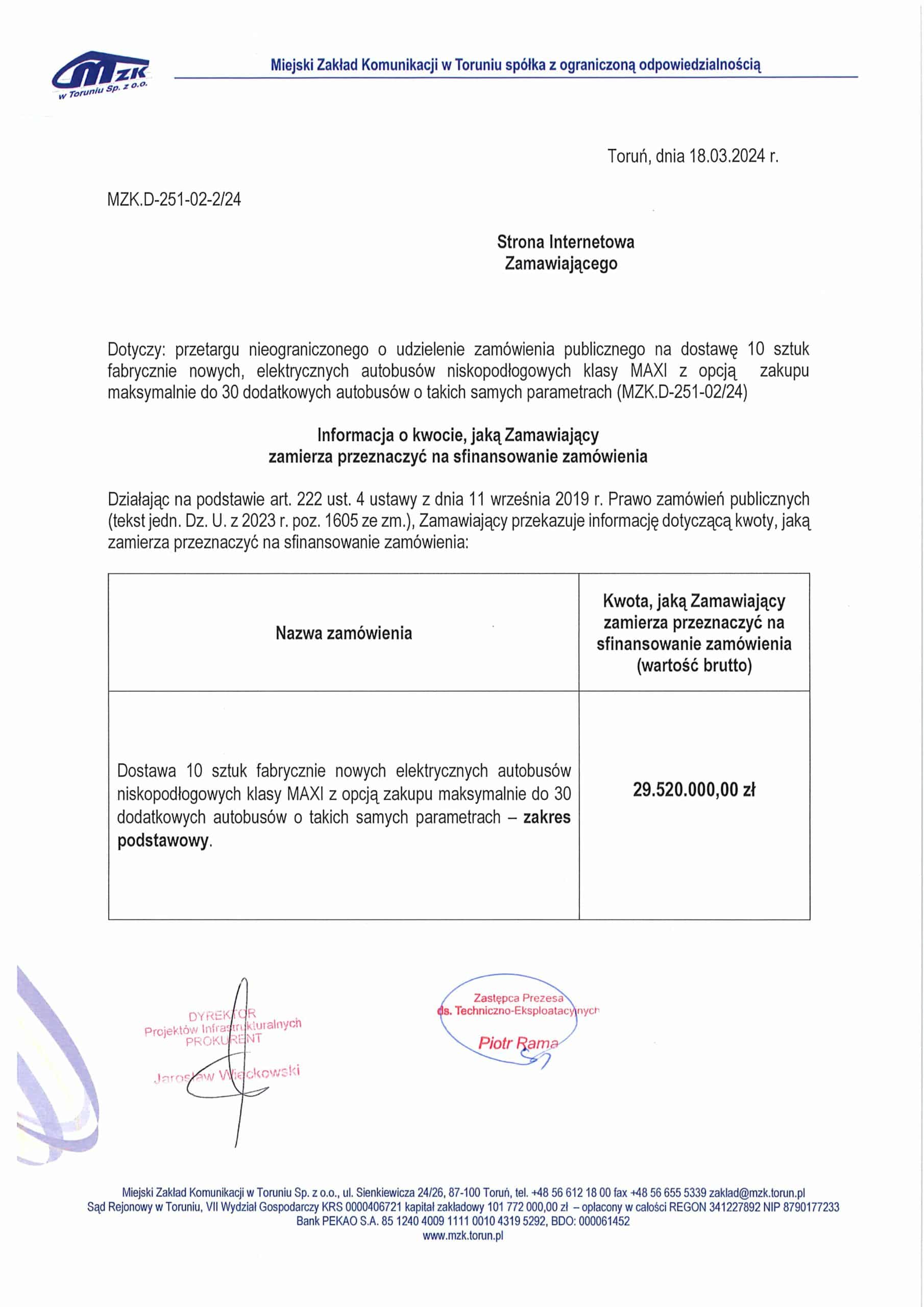 - w wersji podstawowej na sumę 31.488.000,00 PLN brutto / 25.600.000 PLN netto, co daje jednostkową kwotę za Urbino 12 electric na poziomie 2.560.000 PLN netto;