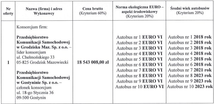 - konsorcjum firm: Przedsiębiorstwo Komunikacji Samochodowej w Grodzisku Maz. sp. z o.o. (lider) oraz Przedsiębiorstwo Komunikacji Samochodowej w Gostyninie sp. z o.o. – cena 18 543 008,00 PLN brutto.