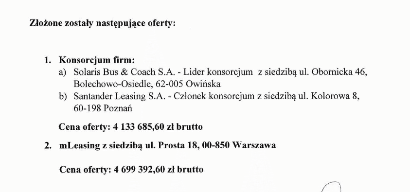 - Solaris Bus & Coach z Santander Leasing z ofertą na trzy pojazdy Urbino 12 za kwotę 4.133.685,60 / 3.360.719 PLN nettto, co daje jednostkową cenę autobusu na poziomie 1.120.239 PLN netto.