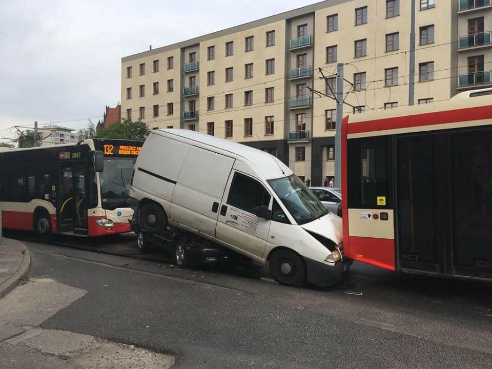 Do zdarzenia doszło w środę około godz. 18.30 na wysokościZieleniaka przy ul. Wały Piastowskie, tuż przed skrzyżowaniem z WałamiJagiellońskimi i Błędnikiem. W stojące na czerwonym świetle osobowe daewoo orazdostawczego citroena jumpera wjechał autobus miejski. Zdarzenie wyglądało dośćgroźnie, bowiem pod wpływem uderzenia tylna oś samochodu dostawczego uniosłasię nad maską osobówki, przygniatając ją.