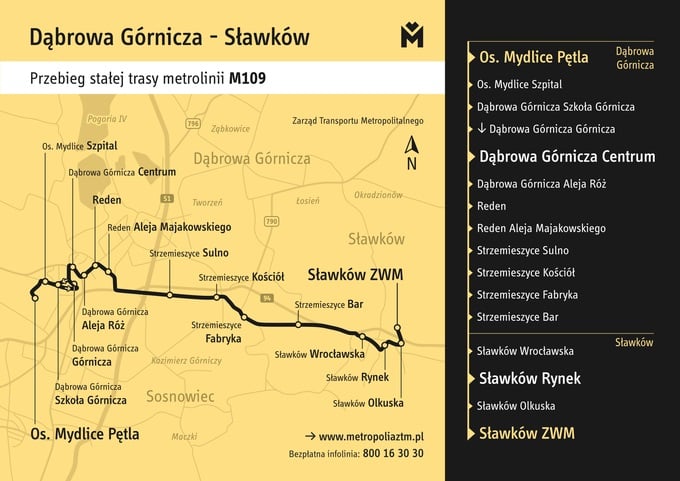 Linia M109 powstanie z przekształcenia linii autobusowej 634 i połączy Sławków z centrum Dąbrowy Górniczej i Mydlicami.