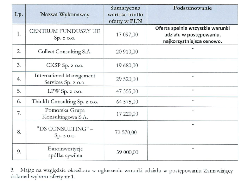 4 października spośród 9 ofert miasto wybrało najkorzystniejszą propozycję (i zarazem najtańszą) - od firmy Centrum Funduszy na sumę 17.097 PLN brutto. Teraz czekamy na umowę i szybką pracę, aby zdążyć przed końcem naboru. Poniżej zestawianie wszystkich ofert: