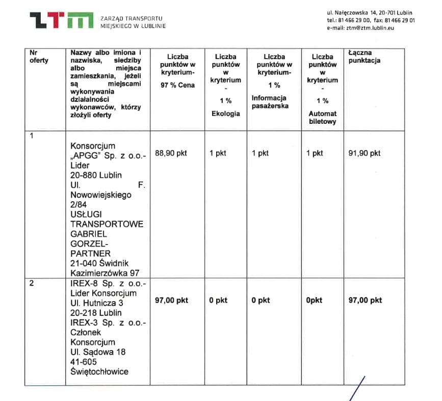 Przypomnijmy, że 20 grudnia Zarząd Transportu Miejskiego w Lublinie otworzył oferty w przetargu, gdzie w części I swoje propozycje złożyły trzy firmy: