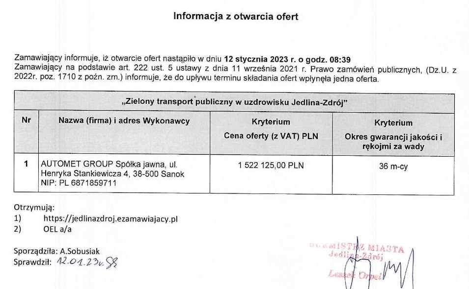 Na oferty Jedlina czekała do 12 stycznia. Swoją propozycję złożyła tylko sanocka firma Automet czyli podobnie jak to było w Niemczy i Ząbkowicach, które również skorzystały ze wsparcia programu NFOŚiGW – „Zielony Transport Publiczny”.