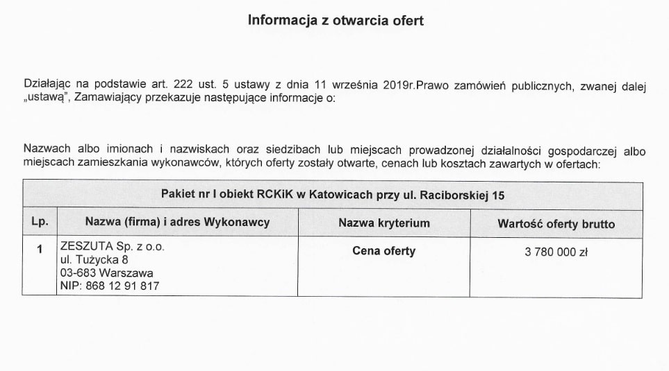 15 grudnia Centrum otrzymało jedną ofertę – od firmy Zeszuta na sumę 3.780.000 PLN brutto. Z kolei budżet zamawiającego to 3.500.000 PLN brutto.