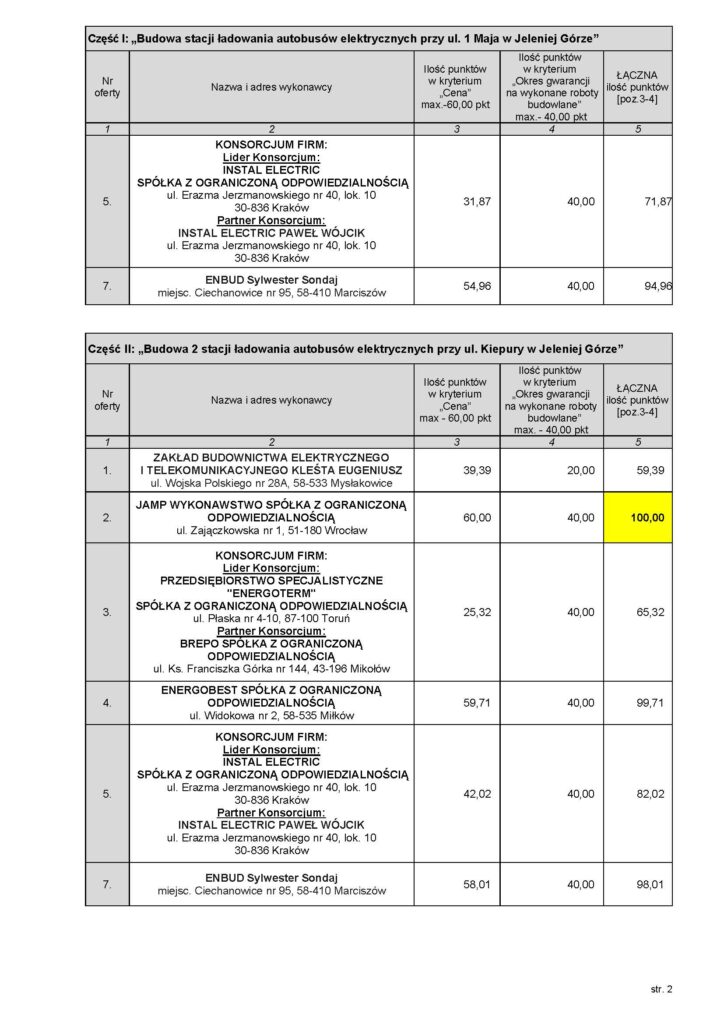 - w zadaniu 1 i 3: ENERGOBEST SPÓŁKA Z OGRANICZONĄ ODPOWIEDZIALNOŚCIĄ, ul. Widokowa nr 2, 58-535 Miłków