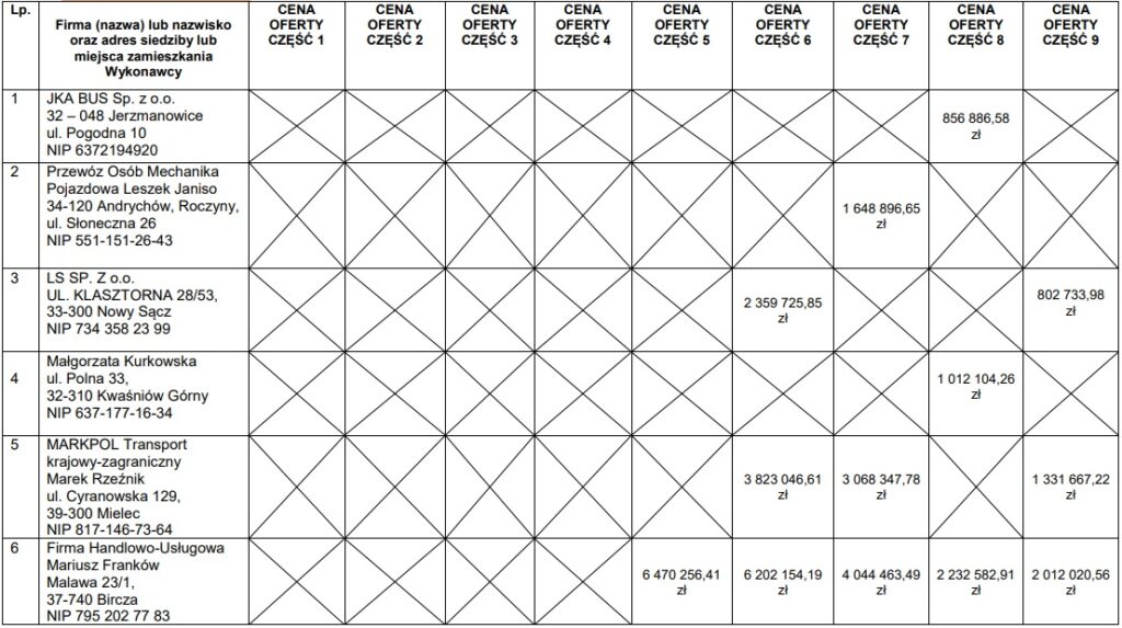 - Konsorcjum: Firma Przewozowa MICHALUS Michał Bodzioch i Przewóz Osób Mechanika Pojazdowa Leszek Janiso – część 5 - 3 195 703,70 PLN,
