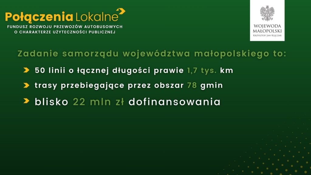 -„Mieszkańcy całej Małopolski artykułowali też wielokrotnie, że w kwestii rozwoju transportu kołowego potrzebne są nowe inicjatywy” - wskazał Klęczar i uściślił, że dodatkowe środki z funduszu autobusowego pozwolą na otwarcie i utrzymanie dodatkowych linii, które przysłużą się do poprawy życia mieszańców.