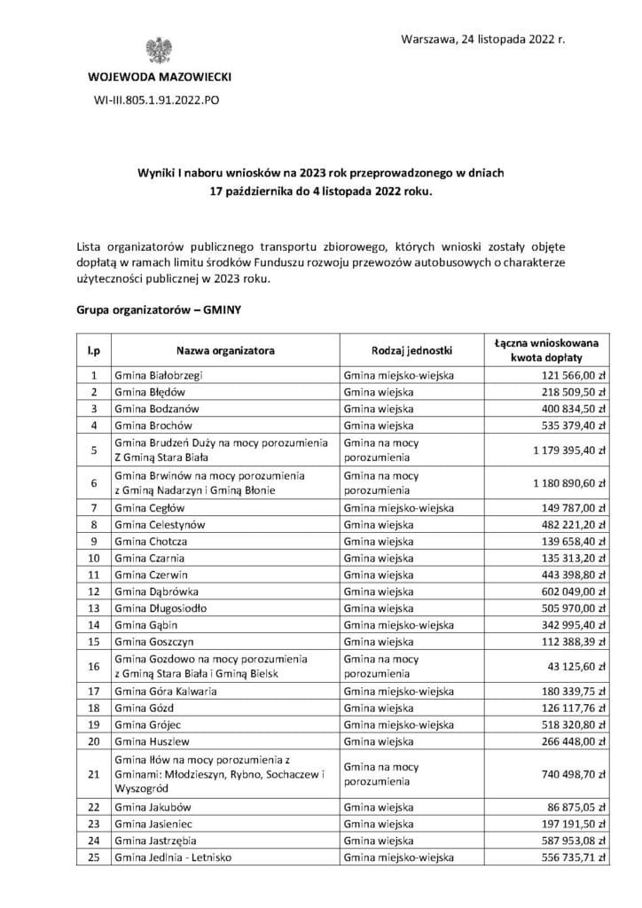 Do 30 listopada wojewoda mazowiecki zawarł łącznie 89 umów na dofinansowanie transportu w roku 2023 z gminami i powiatami na kwotę ponad 66 mln zł.