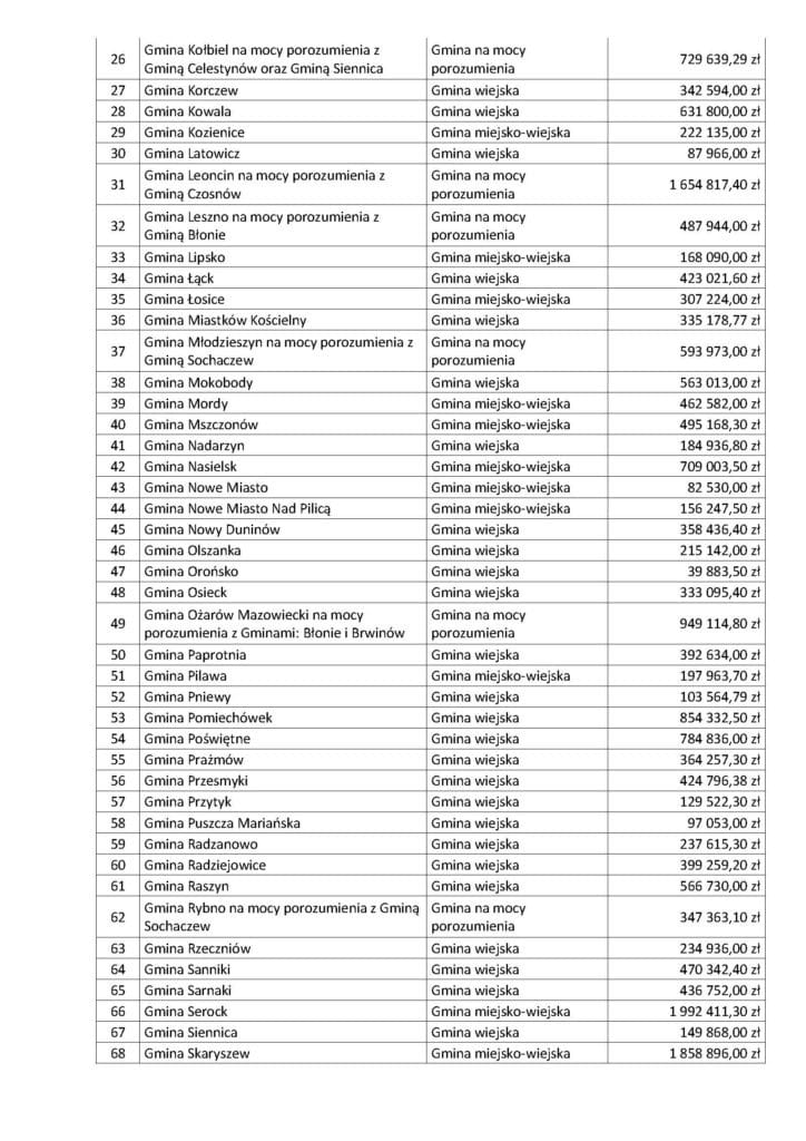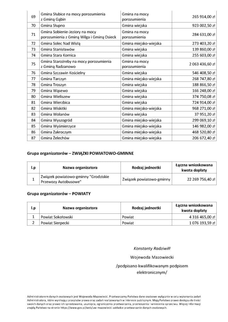 Wśród samorządów, które otrzymały dofinansowanie jest m.in. powiat sokołowski, który uruchomi prawie tysiąc kilometrów linii autobusowych, czy gmina Serock, gdzie powstanie 19 linii komunikacyjnych, o łącznej długości 637,2 k. Łącznie, we wtorek i środę podpisano umowy na ponad 66 mln.