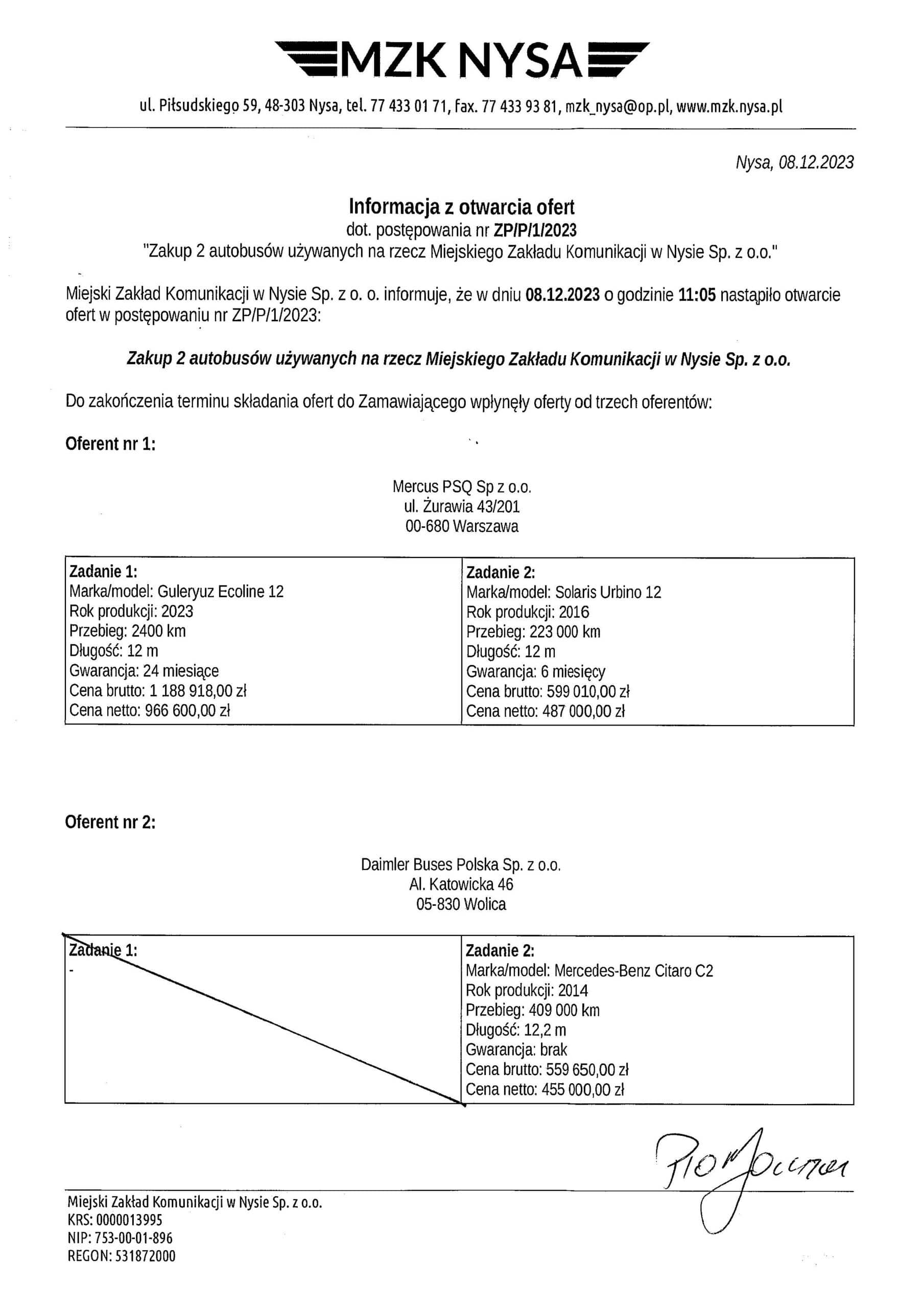 -„Miejski Zakład Komunikacji w Nysie Sp. z o.o. informuje, że w postępowaniu na zakup 2 autobusów używanych na rzecz Miejskiego Zakładu komunikacji w Nysie sp. z o.o., została zakończona wstępna ocena ofert. W związku z faktem, że na każde zadanie wpłynęły tylko po dwie oferty oraz z powodu bliskiej lokalizacji trzech zaoferowanych autobusów komisja powołana do wyboru ofert w tym postępowaniu podjęła decyzję o dokonaniu oceny wszystkich czterech zaoferowanych autobusów. O decyzji komisji dotyczącej ostatecznego wyboru autobusu w każdym zadaniu lub unieważnieniu postępowania Wykonawcy zostaną powiadomieni w Ogłoszeniu o wyborze oferty lub unieważnieniu postępowania.”