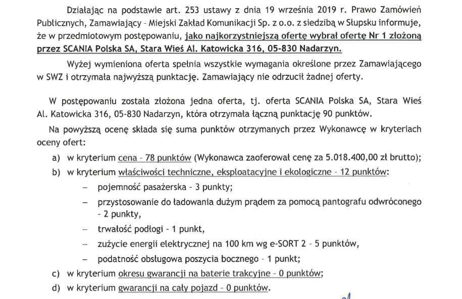 Brak konkurenta wykorzystała Scania, która złożyła droższą ofertę niż ostatnio – na łączną sumę 5.016.400 PLN brutto / 4.078.373 PLN netto, co daje jednostkową cenę modelu Scania Citywide 12 LF BEV na poziomie 2.039.186 PLN netto. Z kolei budżet zamawiającego wynosił 4.674.000 PLN brutto / 3.800.000 PLN netto, co daje jednostkową kwotę za słupski elektrobus na poziomie 1.900.0000 PLN netto.