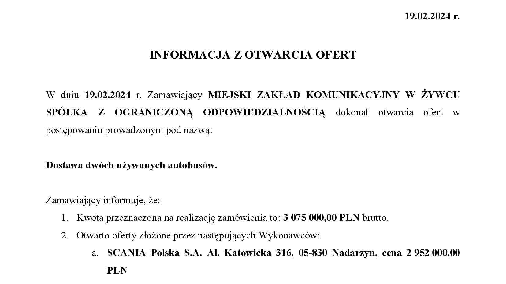 19 stycznia MZK Żywiec otrzymał jedną ofertę – od firmy Scania Polska na sumę 2.952.000,00 PLN brutto, która obejmuje najprawdopodobniej modele Scania Citywide. Takie pojazdy już operują we flicie przewoźnika, także dochodzi nam tutaj aspekt ujednolicania floty.