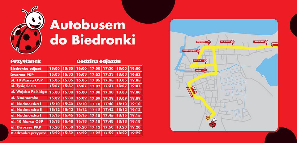 Pierwszy autobus wyrusza z Biedronki w kierunku ul. Nadmorskiej o godzinie 15.00, kolejne natomiast co pół godziny, aż do 19:00, kiedy startuje ostatni kurs. Bilet na przejazd kosztuje symboliczną złotówkę.