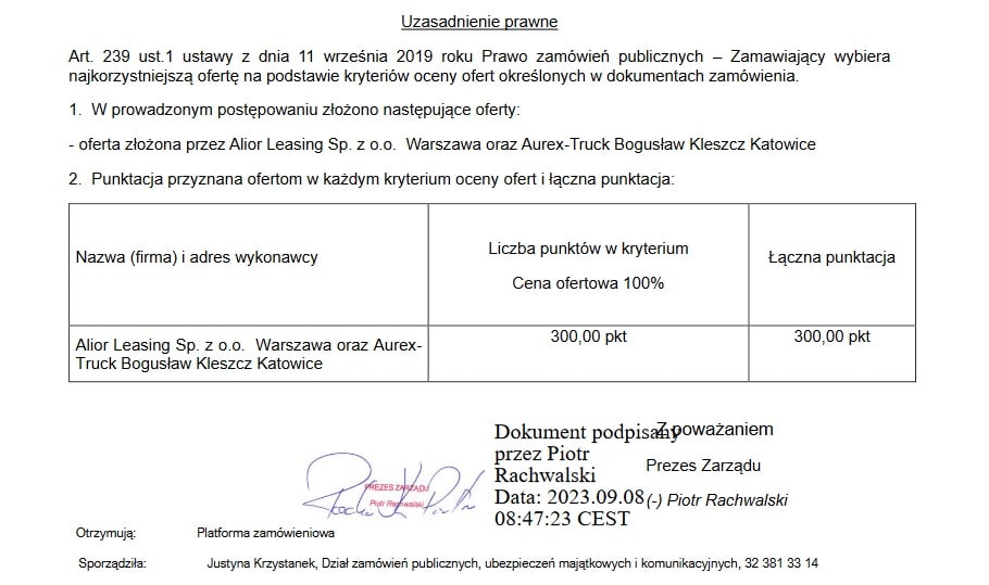 Przy takich wymaganiach, 4 sierpnia PKM Świerklaniec otrzymał tylko jedną ofertę od konsorcjum: Alior Leasing z Warszaw oraz Aurex-Truck Bogusław Kleszcz z Katowic, które zaproponowało sumę 8.122.629,72 PLN brutto, w tym: - zamówienie podstawowe za kwotę 6.498.103,78 PLN brutto, a prawo opcji za 1.624.525,94 PLN brutto.
