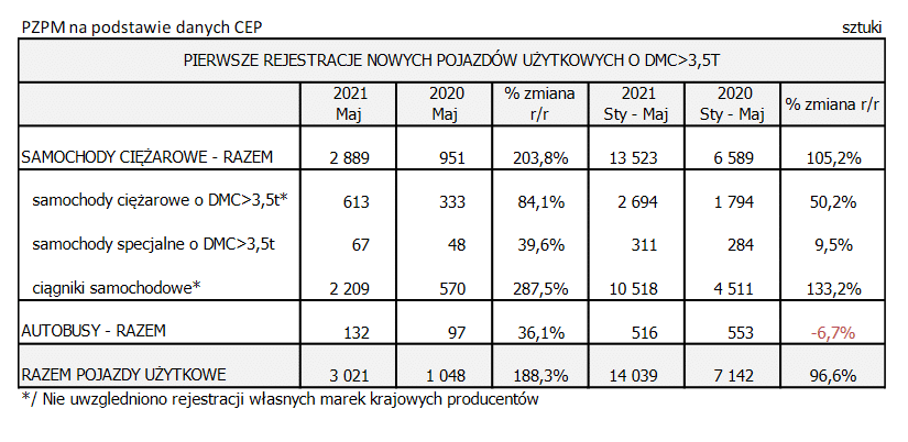 W grupie używanych pojazdów użytkowych o DMC pow. 3,5t sprowadzanych do Polski z zagranicy, w maju 2021 r. zarejestrowano 3 059 szt. przy 82,7% wzroście. Jest to drugi z najlepszych majowych rezultatów, ostatnio więcej w tym samym miesiącu przybyło w 2019 (3534szt.).