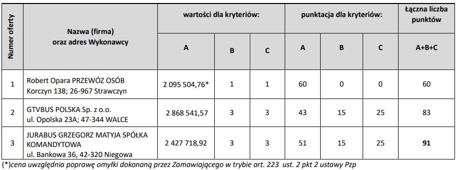W tym przypadku zwycięzcą okazała się firma JURABUS GRZEGORZ MATYJA SPÓŁKA KOMANDYTOWA.