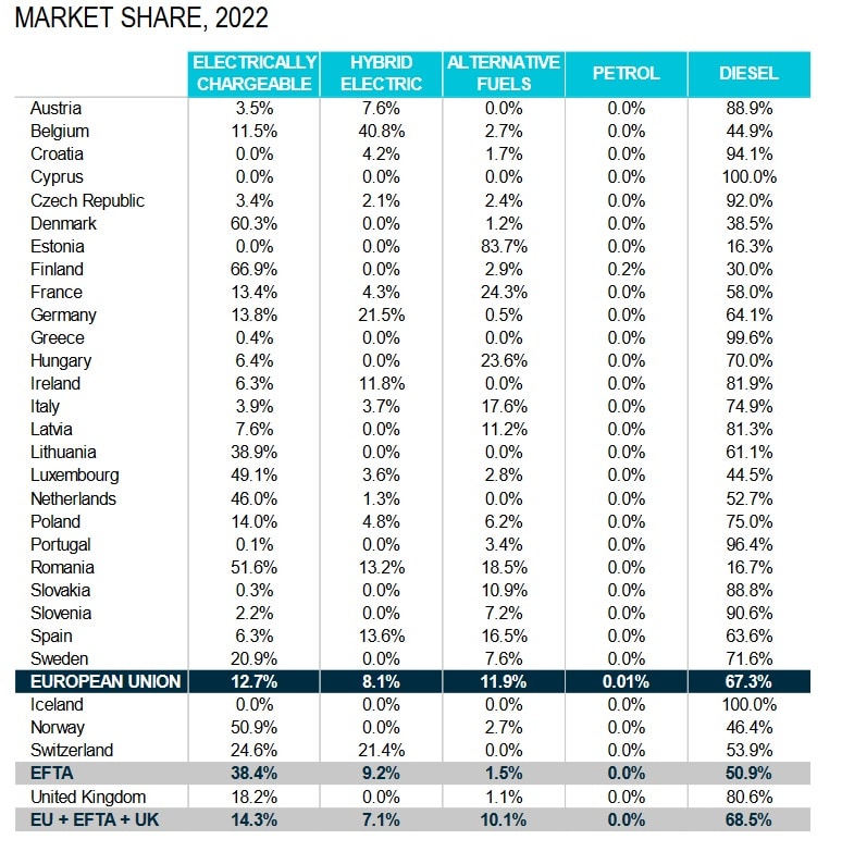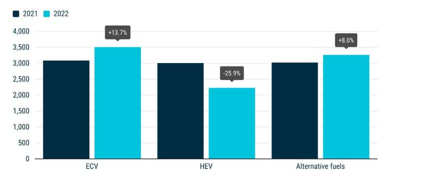 Tymczasem autobusy z napędem elektrycznym nadal zyskiwały na popularności, obejmując 12,7% całego rynku autobusów w UE, wobec 10,6% w 2021 r. W sumie wszystkie pojazdy z napędem alternatywnym stanowiły w ubiegłym roku 32,7% unijnego rynku autobusów.