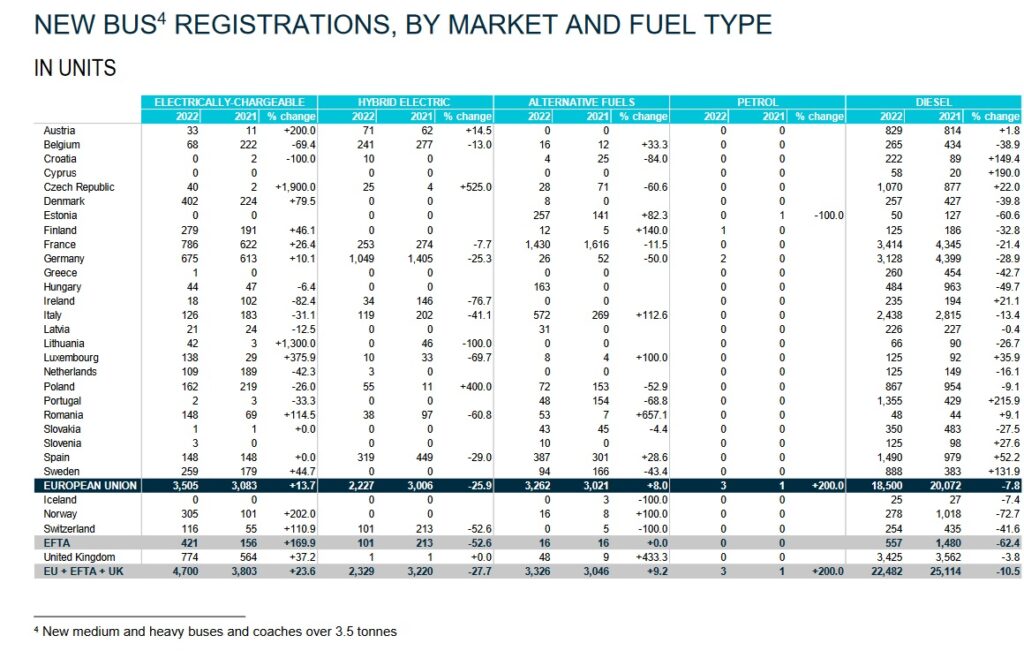 Rejestracje nowych autobusów z silnikiem diesla w UE zmniejszyły się w 2022 r. o 7,8%, do 18 500 sprzedanych sztuk. Jednak najpopularniejsze spośród wszystkich nowych autobusów pozostały autobusy napędzane olejem napędowym, stanowiąc 67,3% całej sprzedaży nowych autobusów.