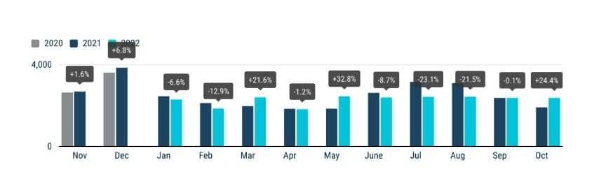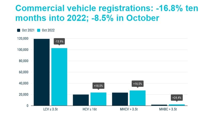 Od stycznia do października 2022 r. rejestracje lekkich samochodów dostawczych w UE zmniejszyły się o 20,6%, do 1 mln sztuk. Z wyjątkiem Czech (+1,6%) i Słowacji (+0,1%), wszystkie rynki UE przyczyniły się do łącznego spadku, w tym cztery największe, które poniosły dwucyfrowe straty: Hiszpania (-25,5%), Francja (-21,1%), Niemcy (-18,7%) i Włochy (-11,9%).