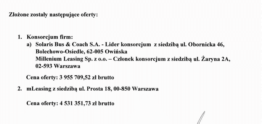 - od Solaris Bus & Coach w konsorcjum z Millenium Leasing z autobusami Urbino 12 na sumę 3.216.023 PLN netto / 3.955.709,52 PLN brutto, co daje jednostkową cenę pojazdu na poziomie 1.072.007 PLN netto;