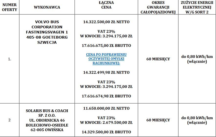 - Volvo Bus Corporation zaproponowało kwotę 17.616.674,98 PLN brutto / 14.322.499,98 PLN netto, co daje jednostkowy koszt zakupu Volvo 7900 Electric na poziomie 2.864.500 PLN netto. Plus deklaracja gwarancji na 60 m-cy oraz zużycie energii przez autobus na poziomie do 0,80 kWh/km (włącznie).