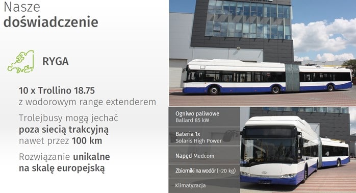 - Solaris Trollino 18,75 electric dla Rygi, gdzie ogniwa paliwowe służą także jako „range extender”, dzięki czemu tego typu pojazdy pokonują poza trakcję nawet do 100 km. Ich układ napędowy opracowała firma Medcom, ogniwa paliwowe 85 kW dostarczył Ballard, a zastosowane bateria to Solaris High Power.