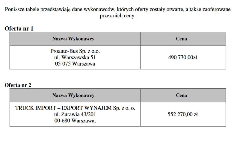 - Proauto-Bus z Warszawy z ceną 490.770,00 PLN brutto / 399.000 PLN netto;