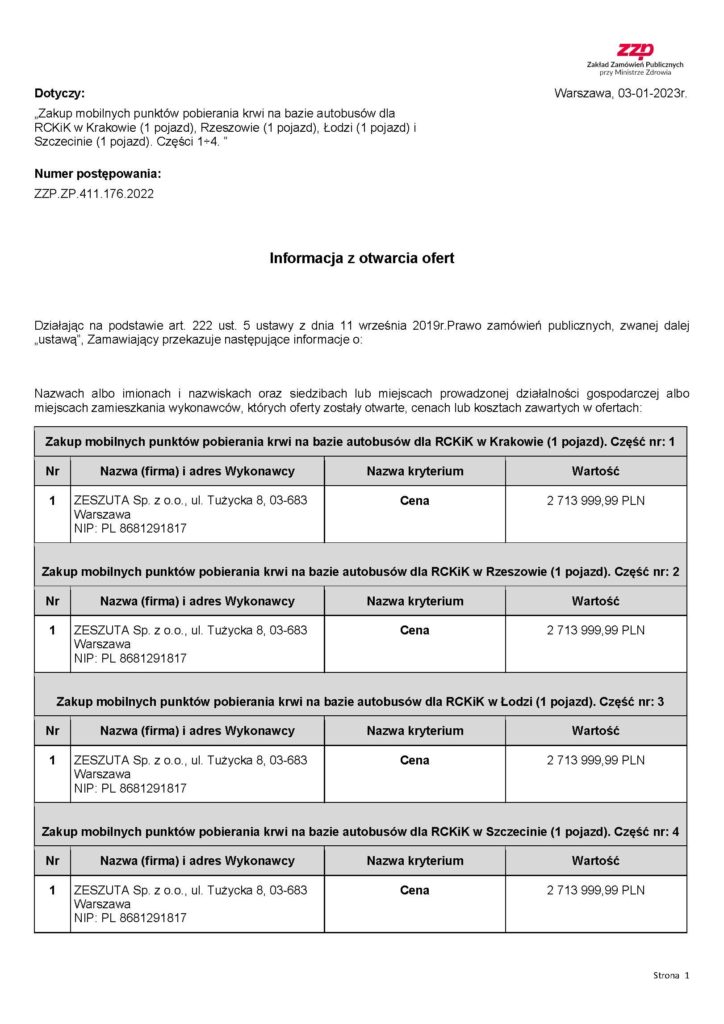 3 stycznia Zakład Zamówień Publicznych przy Ministrze Zdrowia otworzył ofertę w powtórzonym przetargu na dostawę na czterech ambulansów do poboru krwi na bazie wyskopokładowych autobusów turystycznych.