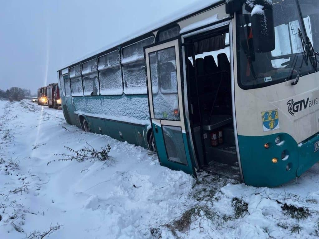 Zima w Opolskim: Autobus w rowie. Nikomu nic się nie stało