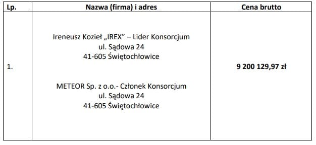 - przetarg nr 2 – konsorcjum Ireneusz Kozieł „IREX” i METEOR Sp. z o.o.- cena 9 200 129,97 PLN,