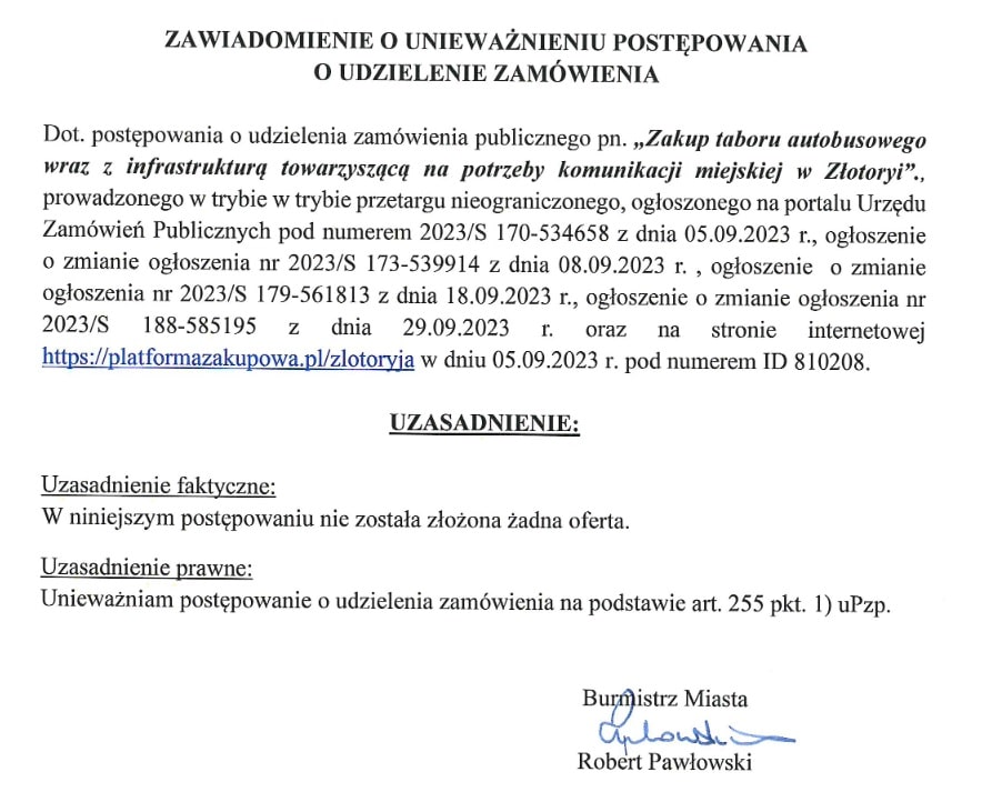 Więcej o tym zamówieniu na https://platformazakupowa.pl/zlotoryja/aukcje , a poniżej poprzednia decyzja o unieważnieniu przetargu numer 1.