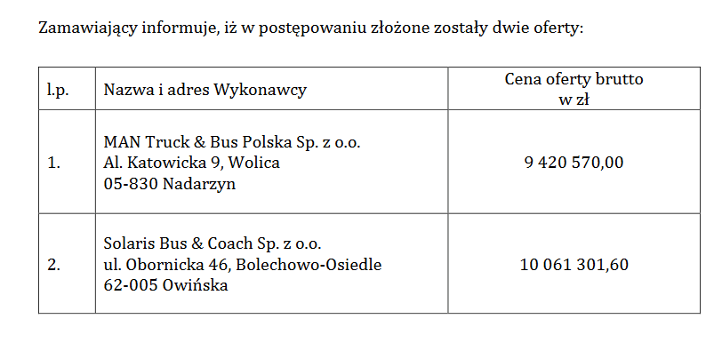 - MAN Truck & Bus Polska Sp. z o.o. – cena 9 420 570,00 PLN brutto (cena z poprzedniego przetargu - 10 715 760,00 PLN),