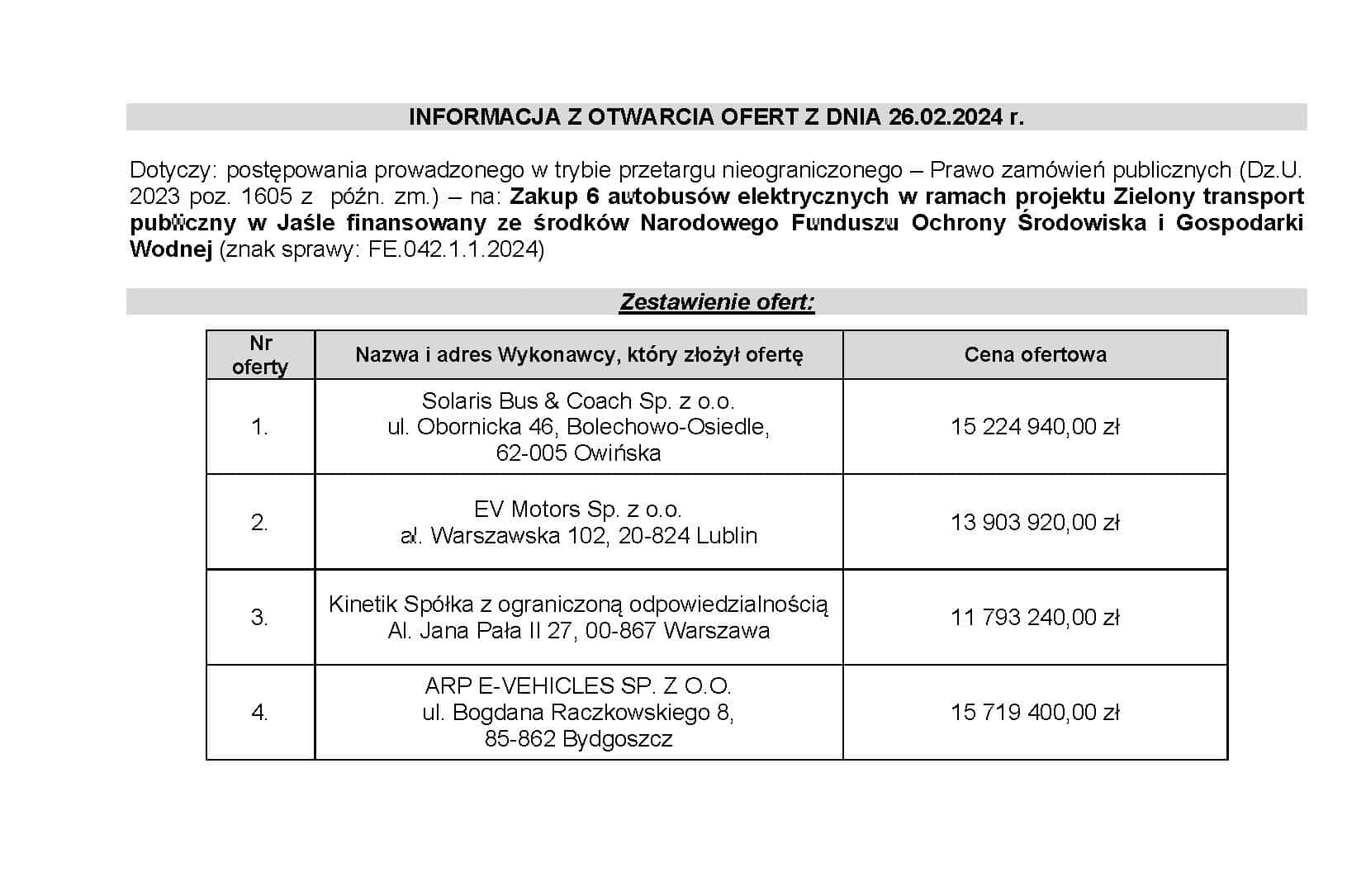 28 lutego Urząd Miejski w Jaśle opublikował oferty, jakie otrzymał dwa dni wcześniej w przetargu na dostawę sześciu autobusów elektrycznych kategorii MIDI.