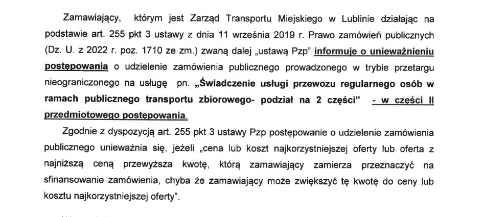 27 grudnia Zarząd Transportu Miejskiego w Lublinie podjął decyzję o unieważnieniu zadania numer II na obsługę wybranych linii autobusowych.