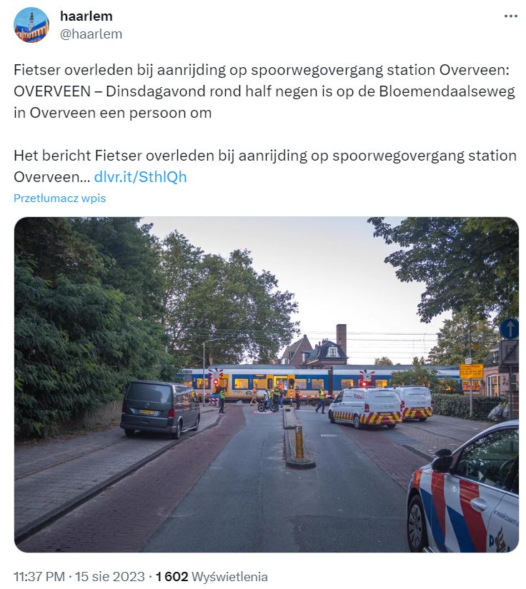 Rowerzysta z Polski wjechał pod pociąg w Holandii; nie przeżył