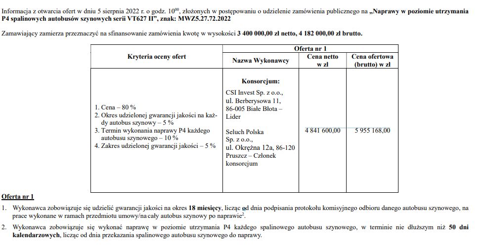 Ofertę złożyło konsorcjum CSI Invest Sp. z o.o. oraz Seluch Polska Sp. z o.o. z ceną 4 841 600,00netto/ 5 955 168,00 brutto. Zamawiający zamierza przeznaczyć na sfinansowanie zamówienia kwotę w wysokości 3 400 000,00 zł netto, 4 182 000,00 zł brutto.