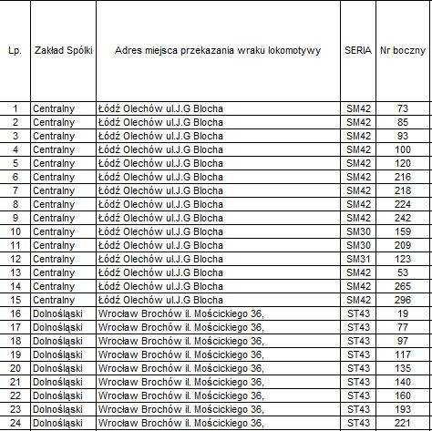 Wśród lokomotyw przeznaczonych do kasacji są zarówno temanewrowe, jak i trakcyjne, spalinowe i elektryczne. Do kasacji mają trafićmaszyny serii: SM42, SM30, ST43, SP32, ET22, ET41 czy SU45.