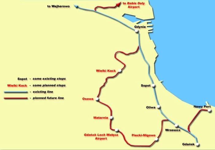 Dopiero przyznanie Polsce organizacji Mistrzostw Piłkarskich Euro 2012 przyniosło szereg pomysłów na usprawnienia w zakresie transportu publicznego. Ponieważ jeden ze stadionów dla Euro ma powstać w Gdański, więc jasnym było, że obecny układ nie będzie w stanie przewieźć zakładanej liczby osób. W efekcie euforii padło wiele pomysłów, które można spokojnie przyrównać do „owczego pędu”. Jednak wśród steku dziwacznych pomysłów pojawiały się również takie, które byłyby przydatne tak dla potrzeb organizacji mistrzostw jak też dla codziennego życia aglomeracji. Najważniejszym pomysłem było stworzenie nowej linii SKM. Linia ta miałaby stanowić realizację postulowanej już kiedyś trasy z Gdyni przez Gdańsk Osowę, Lotnisko, Kokoszki do dworca Głównego w Gdańsku. Na odcinku od Gdyni do portu lotniczego wykorzystywałaby obecną infrastrukturę po gruntownej przebudowie. Dalej byłaby to trasa budowana od podstaw po śladzie dawnej linii z Kokoszek do Gdańska Wrzeszcza. Oczywiście za wyjątkiem odcinka Lotnisko –Kokoszki, który powstałby od podstaw. Częścią tego projektu miałaby być reaktywacja linii z Gdańska Głównego do Nowego Portu. W efekcie uzyskano by bezpośrednie połączenie portu lotniczego ze stadionem z którego mogliby skorzystać kibice. Jednak nieprzekraczalną datą jest tutaj rok 2012, a póki co przez dwa lata nic nie uczyniono w tej materii. Urząd Marszałkowski, odpowiedzialny za przewozy pasażerskie na terenie województwa, zamierza zgłosić projekt tej linii określany obecnie jako Kolej Metropolitalna do Programu Operacyjnego Infrastruktura i Środowisko, gdzie znajduje się suma 600 mln euro przeznaczona dla miast organizujących Euro 2012. Projekt nowej linii jest szacowany na 170 mln euro, jednak jak na razie brak decyzji o sfinansowaniu tej inwestycji. Brak również jasnej odpowiedzi kto będzie operatorem przewozów na tej trasie –SKM w Trójmieście czy PKP Przewozy Regionalne.