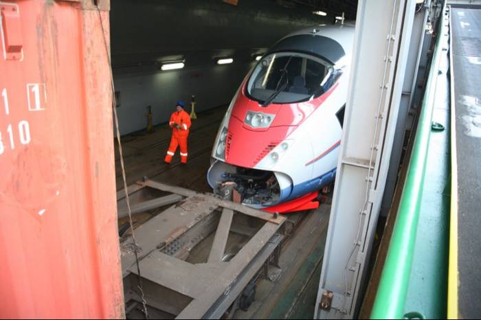 DB Schenker rozpoczęło transport pierwszego z ośmiu składów Velaro RUS produkcji Siemens Mobility Division przeznaczonego dla kolei rosyjskich RŻD. W dniu 13 listopada 2008 roku w porcie Sassnitz/Mukran miał miejsce załadunek składu na statek, który dostarczy pociąg do rosyjskiego portu na morzu Bałtyckim Ust Luga. Z zakładu w Krefeld do portu skład był transportowany drogą jako przesyłka ponadgabarytowa, co było efektem przekroczenia skrajni DB zarówno przez wózki jak i szerokiego pudła. Po dotarciu do portu wagony były rozładowywane za pomocą dźwigów. Port w Sasnitz/Murkan jest jedynym w Niemczech, który posiada również tory szerokotorowe 1520 mm stosowane w Rosji. Dodatkowo taki rozstaw szyn ma również prom, dzięki czemu na pokład pociąg wjechał już na własnych kołach, choć podzielony na dwie pięciowagonowe części i był zabezpieczony rosyjskimi wagonami ochronnymi (wykonane według skrajni rosyjskiej i wyposażone w sprzęgi samoczynne). Prom do Ust Luga popłynie w 50 godzin, skąd skład uda się do oddalonego o 150 km St. Petersburga.