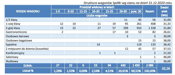 Według stanu na dzień 31 grudnia 2020 roku Spółka posiadała na stanie 2 086 wagonów pasażerskich oraz dodatkowo 4 wagony zabytkowe, wybudowane w latach 1929 i 1956.