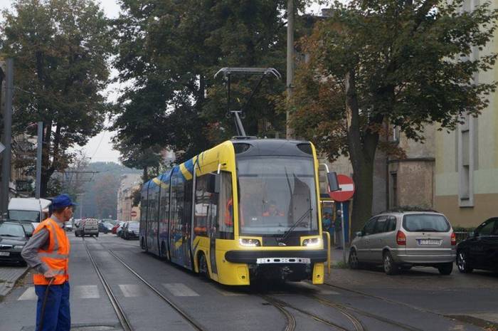 Dziś w godzinach porannych do Torunia przybył pierwszy Swing dla tamtejszego MZK. Przyjazd nowego i jednocześnie najnowocześniejszego w historii miasta wagonu to ważne wydarzenie w historii toruńskiej komunikacji publicznej. Nie ma się zatem co dziwić, że towarzyszyła mu rzesza obserwatorów. Pierwszy pięcioczłonowy Swing po rozładunku zjechał do zajezdni. Na jutro zaplanowana została oficjalne prezentacja wagonu. Przypomnijmy, że MZK zakupiło łącznie 12 niskopodłogowych tramwajów, po sześć pięcio i trzyczłonowych. Łączna wartość projektu to 92 mln zł. Swing dla Torunia jest, zgodnie z zapowiedziami, nieco inny od tych, które znamy z Warszawy czy Gdańska. Na uwagę zasługuje także niebiesko-żółta malatura, wybrana przez mieszkańców w głosowaniu. Takie barwy mają także siedziska, które zostały wykonane z trudno zapalnego materiału, odpornego na ścieranie i łatwego do utrzymania w czystości. Zastosowane w pojazdach rozwiązania techniczne sprzyjają oszczędzaniu energii i obniżeniu kosztów eksploatacji. Istotną kwestią jest bezpieczeństwo nowego taboru. Podłoga w wagonie została wyłożona wykładziną antypoślizgową, a na całej długości znajdują się uchwyty i poręcze umożliwiające pasażerom utrzymanie równowagi w czasie jazdy. Nie ma ostrych krawędzi i innych elementów mogących spowodować urazy. Pojazd jest wyposażony w system informacji pasażerskiej w czasie rzeczywistym, a przystanki będą zapowiadane. Są też liczniki pasażerów, dzięki którym układanie rozkładów jazdy ma być bardziej efektywne.