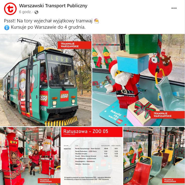 Reklamowy tramwaj LEGO - pomalowany na seledynowy kolor skład Konstal 105N - będzie jeździł do 4 grudnia. W dni powszednie można go spotkać na trasie Ratuszowa-ZOO - Zajezdnia Mokotów, a w weekendy Ratuszowa-ZOO - PKP Służewiec. Szczegółowy rozkład dostępny jest na profilu Tramwajów Warszawskich na Facebooku. (PAP)