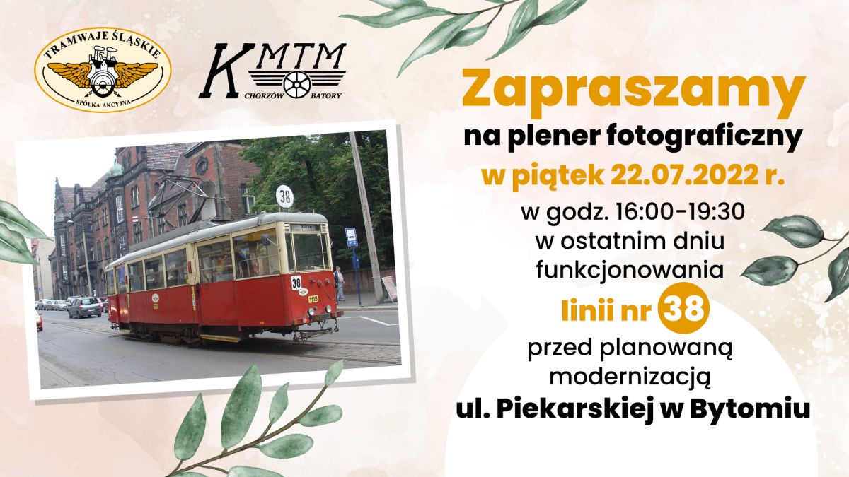 W piątek 22.07.2022 r. linia nr 38 w swoim dotychczasowym kształcie będzie kursować po raz ostatni. – Dla wielu mieszkańców, miłośników i sympatyków to wydarzenie o historycznym znaczeniu. Tego ostatniego dnia, w ostatnich godzinach kursowania linii nr 38 zapraszamy wszystkich na plener fotograficzny, by zdążyć uwiecznić najkrótszą w Europie linię tramwajowym, nim zostanie przebudowana i wydłużona. Historycznym wagonom typu N nie powiemy jednak „żegnajcie”, lecz „do zobaczenia” – mówi Andrzej Zowada, rzecznik spółki Tramwaje Śląskie S.A. i dodaje: – Fotografować i rejestrować nagrania na ulicy Piekarskiej będzie można oczywiście przez cały dzień, ale od 16:00 do 19:30 motorniczy będzie uśmiechał się wyjątkowo pięknie a wagon będzie cierpliwie pozować do zdjęć.
