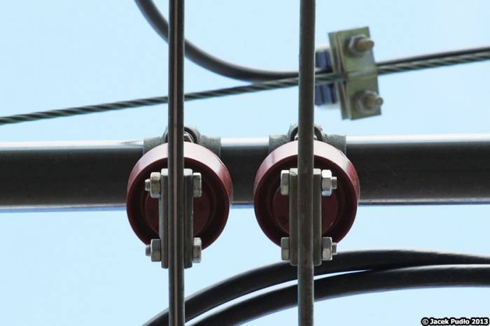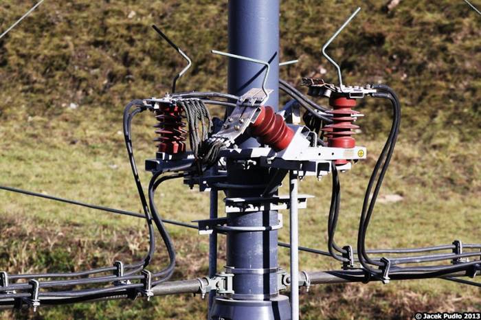 Z szyny ruchomej rozłącznika wyprowadzone są kable, zamocowane do pomocniczego izolatora i wysięgnika –tyczki ze szkłolaminatu. Kable biegną od słupa aż do przewodów sieci trakcyjnej, gdzie za pomocą uchwytów zasilających połączone są z przewodami jezdnymi.