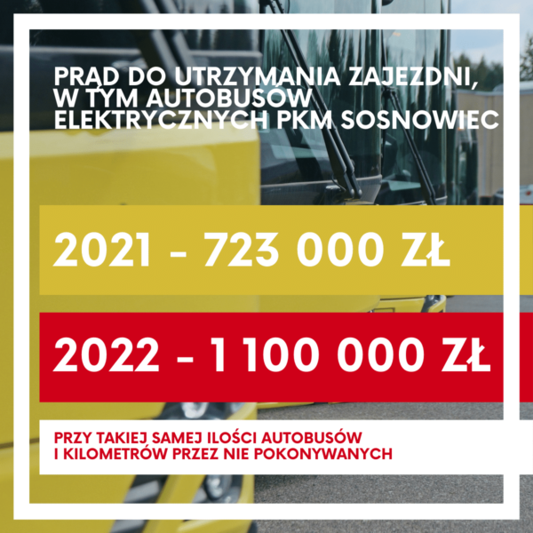 Koszt zakupu energii do utrzymania zajezdni, w tym autobusów elektrycznych Przedsiębiorstwa Komunikacji Miejskiej w Sosnowcu, wzrośnie z 723 tys. zł w br. do 1,1 mln zł w 2022 r. - przy założeniu tej samej liczby autobusów i pokonywanych przez nie kilometrów. Koszt ładowania jednego autobusu w ciągu roku wzrośnie z 34 tys. zł do 51 tys. zł.