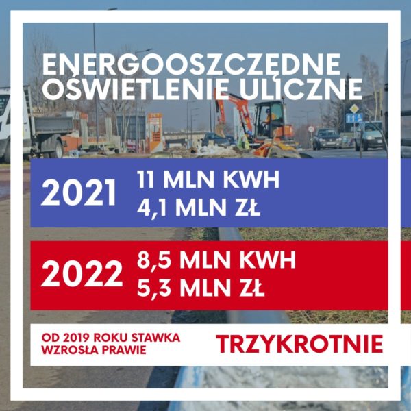 Koszt zużycia energii w sosnowieckich wodociągach wzrośnie z 4 mln zł do 6 mln zł. Energooszczędne oświetlenie uliczne, które po ostatnich wielomilionowych inwestycjach miasta umożliwi zmniejszenie tam poboru energii z 12,5 mln kilowatogodzin w 2020 r., 11 mln kWh w 2021 r. do 8,5 mln kWh w przyszłym roku, pochłonie w nim 5,3 mln zł, wobec 4,1 mln zł w 2021 r. i 2,9 mln zł w 2020 r.