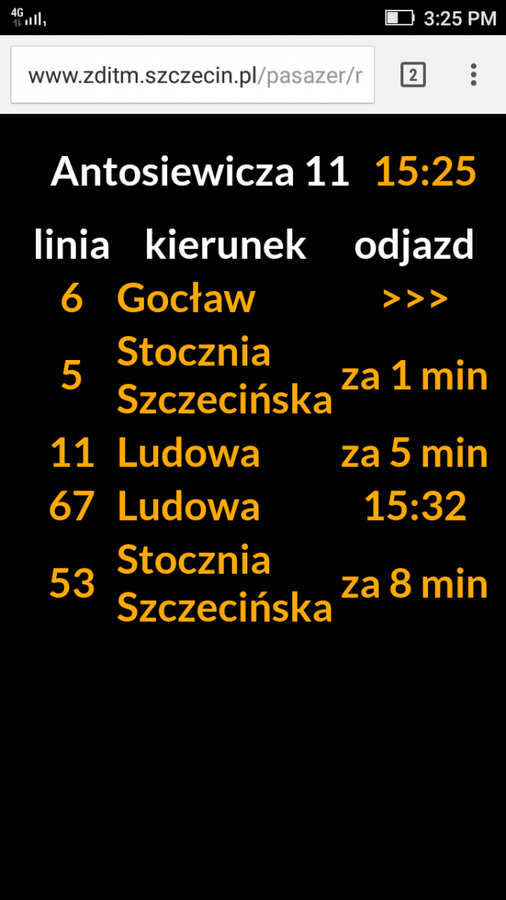 Szczecińska wirtualna tablica informacji pasażerskiej na ekranie telefonu